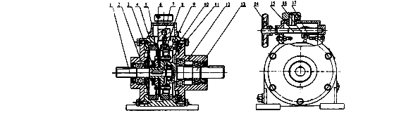 1、輸入軸 2、輸入法蘭盤 3、碟形彈簧 4、箱體 5、固定摩擦環(huán) 6、太陽輪壓緊盤 7、錐形摩擦盤 8、移動凸輪 9、滑快 10、固定凸輪 11、太陽輪 12、輸出法蘭盤 13、輸出軸 14、手輪 15、調(diào)速螺桿 16、撥頭 17、調(diào)速螺母 |